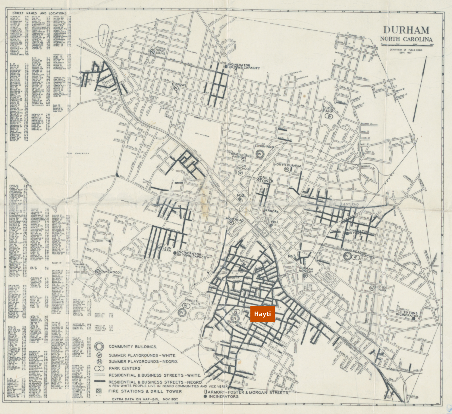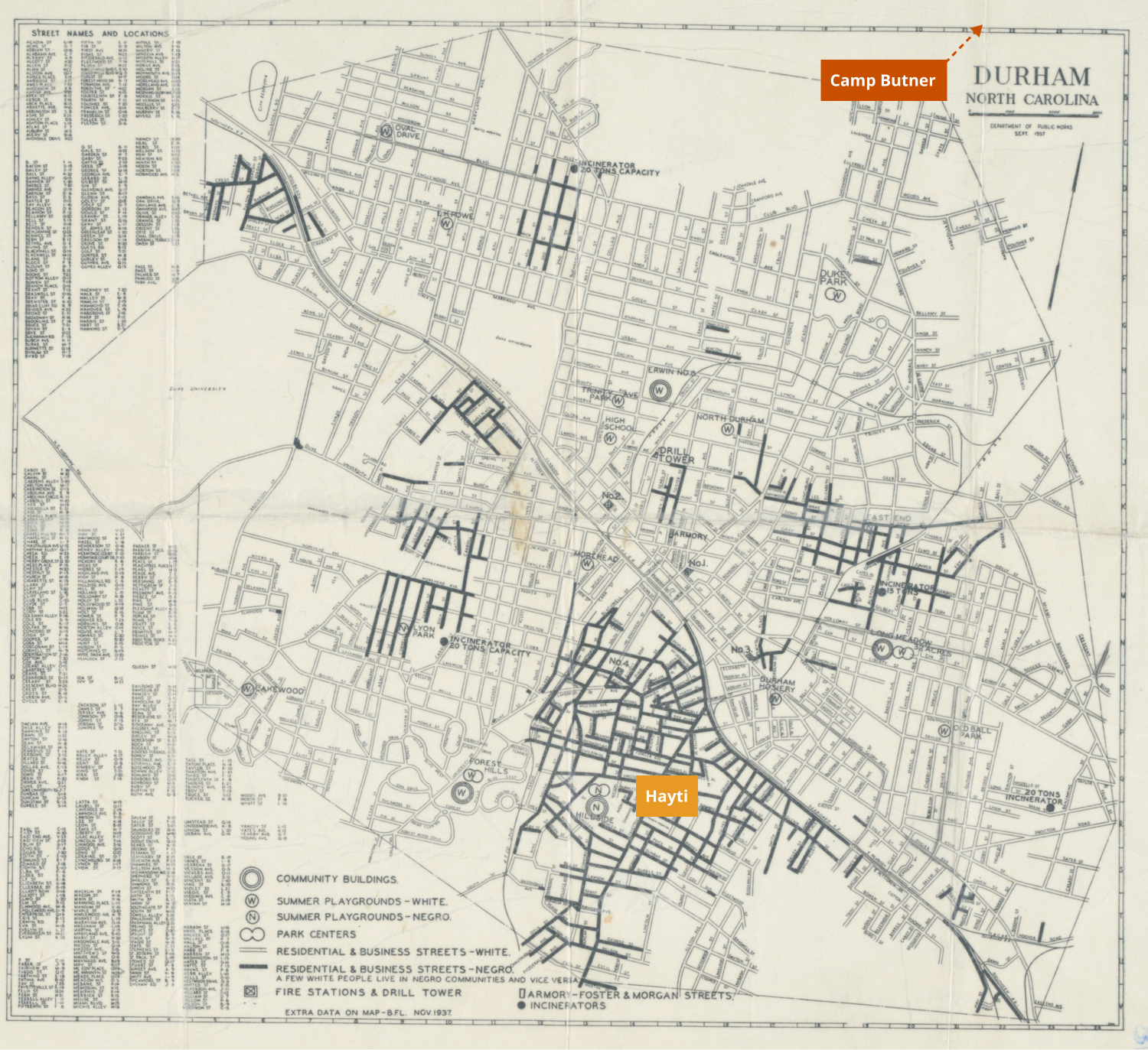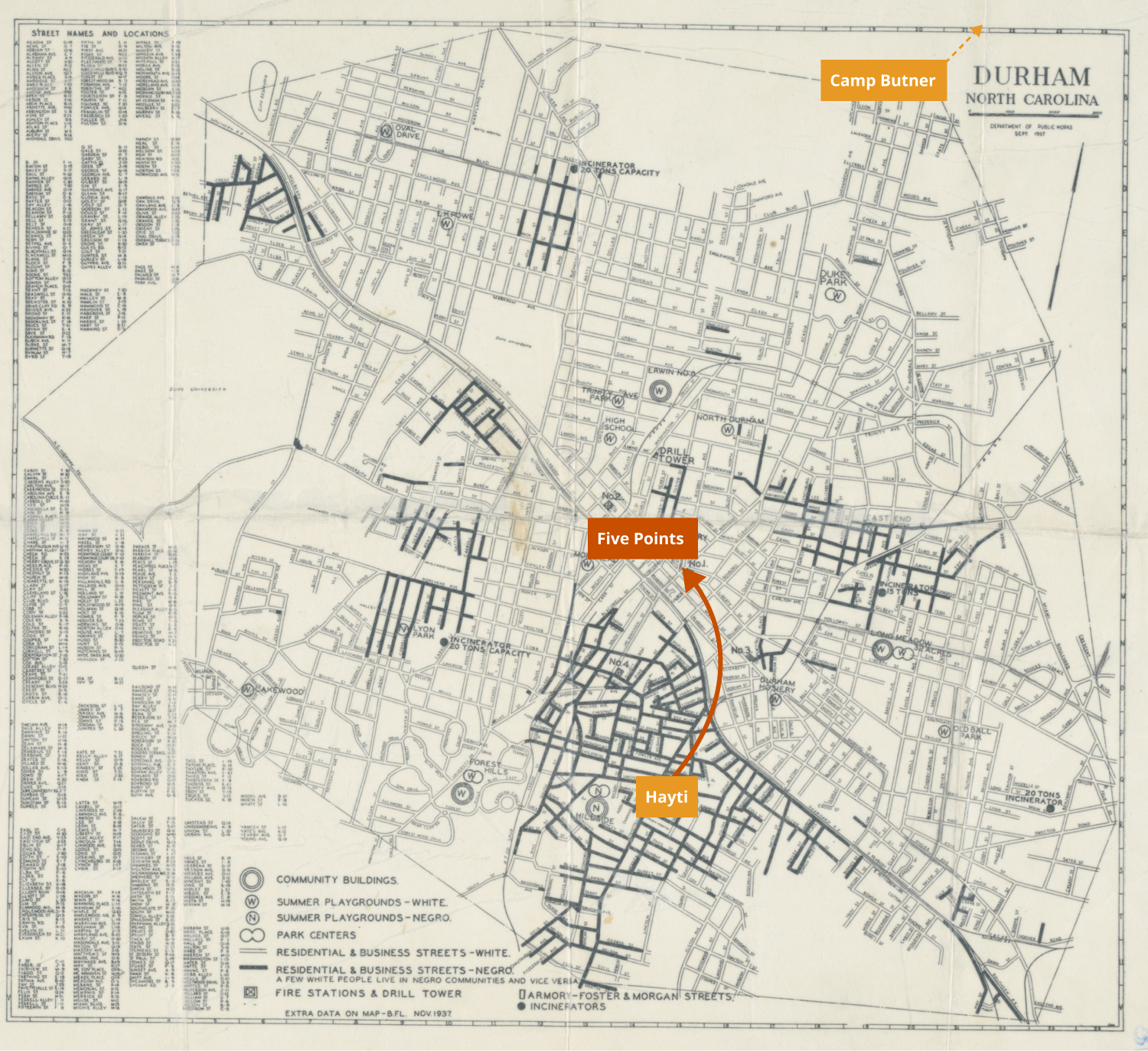 Images courtesy of Duke University (map), Durham County Library (Hayti), John Schelp (Camp Butner, Five Points), and the (Durham) Herald-Sun via Preservation Durham (Walltown).