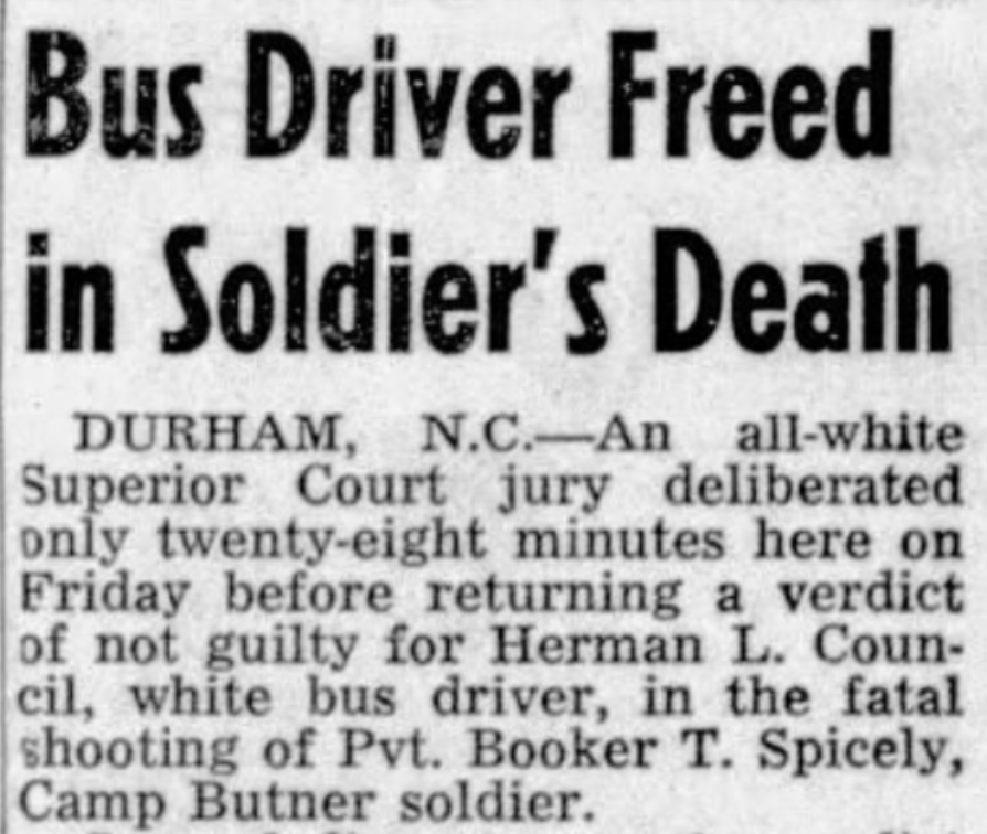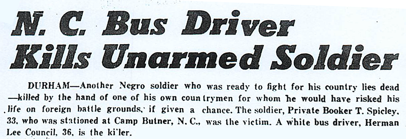 On the evening of Saturday, July 8, 1944, 34-year-old Army Private Booker T. Spicely climbed the steps of a local bus in Durham, North Carolina.